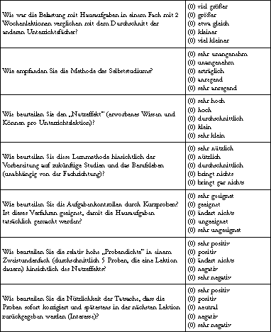 Ausgeteilt wurde der nachstehende Fragebogen mit sieben Fragen zu der Unterrichtsmethode. Gewählt wurde das heute übliche 5-Punkte-System: Für die Beurteilung "gerade recht" oder "durchschnitt-lich" wurden null Punkte verrechnet, für "schlechter als üblich" ­p;1, für "viel schlechter als sonst" ­p;2, für "besser als sonst" +1 und für "viel besser als sonst" +2 Punkte. Auf diese Weise kann ermittelt werden, ob die Befragten im Mittel die Sache eher positiv oder negativ beurteilen und vor allem auch, wie stark diese Gewichtung ausfällt.