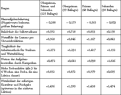 Wie die Tabelle mit den Ergebnissen der Umfrage zeigt, wird die Hausaufgabenbelastung als etwas größer als durchschnittlich (Mittel -0,288) angegeben. In den Sekunden, wo als Versuch Woche für Woche ohne Ausnahme die Hausaufgaben in der zweiten Unterrichtslektion durch Kurzproben kontrolliert wurden (was für den Lehrer aufwendig ist), ist die Mehrbelastung nicht mehr signifikant (Mittel -0,053).