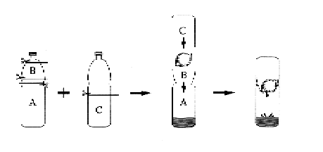 Prendre 2 bouteilles en PET de 1,5 l. Les couper avec des ciseaux selon le schéma en 3 parties A, B et C. Introduire en A 100 ml d'alcool pur ou de vodka. Poser l'entonnoir B sur A et déposer en B un citron entier (ou un autre agrume). Emboîter la partie C inversée sur B et A. Du ruban adhésif peut être utilisé au point de contact entre A et C afin d'obtenir une meilleure étanchéité. La partie B peut être perforée en différents endroits pour améliorer l'extraction. Notons encore que la plupart des bouteilles en PET peuvent être utilisées, quelle que soit leur contenance.