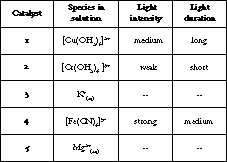 On the contrary, in the complexes ,[Fe(CN)6]3-and [Cu(OH2)6]2+ , the electron removed on the H2O2 molecule by the metal, is placed into t2g orbitals unsymmetrically occupied. In this process, t2g orbitals acquire a new symmetrical and complete electronic configuration. Comparatively with the Cr(III) complex, this observation is a good remark that illustrates the efficacy of these two metals as oxidants in the luminol reaction. Moreover, considering the energy level of t2g orbitals in these complexes we believe that the oxidative action of [Fe(CN)6]3- is larger than [Cu(OH2)6]2+,. This is due to the removal of the electron on H2O2 that falls in the low t2g energy level of the Fe(III) complex. This observation agrees with values obtained in the literature for these complexes.9