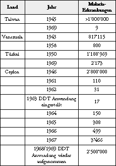 Der Einfluß von DDT auf die Malaria hat in den Tropen Ende der siebziger Jahre nicht nur durch das Absetzen von DDT, sondern auch durch Resistenzentwicklung der Anopheles (Überträger-Mücke) wieder stark zugenommen.