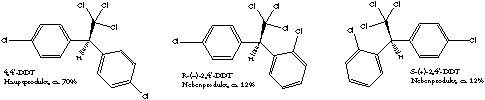 Überraschend hat man 1995 herausgefunden, dass eigentlich gar nicht das DDT selbst für die negativen Wirkungen verantwortlich ist, sondern das Nebenprodukt 2,4'-DDT, welches bei der technischen Synthese mit bis zu 25% anfällt10. Dieses tritt in zwei spiegelbildlichen, chiralen Formen auf.